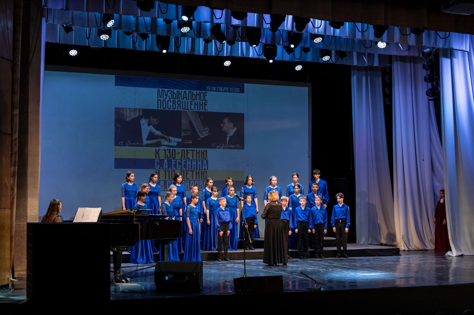 В первом отделении концерта "Музыкальное посвящение" прозвучала кантата Георгия Свиридова "Памяти Сергея Есенина" в исполнении сводного молодежного хора, а во втором каждый из участников - детских хоровых коллективов города и области - исполнили произведения великих русских гениев.